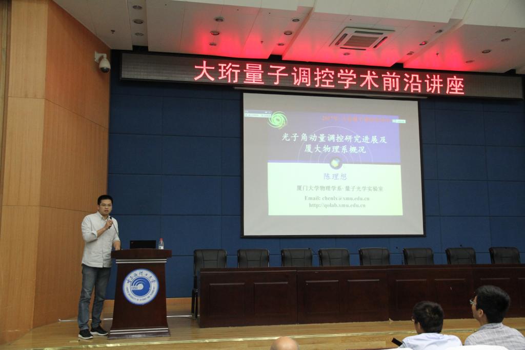 陈理想教授作了题为“光子轨道角动量调控进展及厦大物理系概况”的报告,在史老师前序报告的基础上讲述了光子轨道角动量在光子学与量子光学中的基础前沿研究;此外,还对厦大物理学研究生培养及大珩量子协创中心研究生跨单位联合培养模式进行了简介。