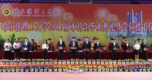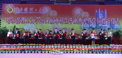 雄壮的国歌拉开了毕业典礼的帷幕,悠扬的校歌奏响了毕业生踏上新征程的进行曲。副校长、校学位评定委员会副主席刘胜辉首先宣读了哈尔滨理工大学《关于2017届本科毕业生准予毕业的决定》及《校学位评定委员会决议》;校长、校学位评定委员会主席李大勇为来自不同专业的64位毕业生代表授予了学位,同时颁发毕业证书和学位证书;校党委副书记陆岩宣读了《关于表彰2017届优秀本专科毕业生的决定》;学校领导和嘉宾为优秀毕业生颁发获奖证书;纪委书记王志浩宣读了《关于表彰2017届心系祖国需要、志愿服务基层优秀毕业生的决定》。学校领导分别为“心系祖国需要、志愿服务基层”优秀毕业生和校级优秀毕业生颁发荣誉证书及奖金。