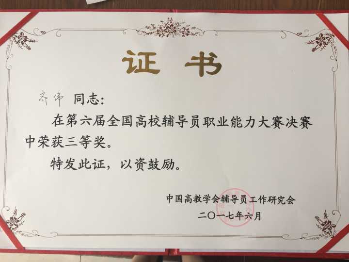 近日,第六届全国高校辅导员职业能力大赛决赛在北京交通大学举行,来自全国6个赛区的69名优秀辅导员参加本次比赛,我校辅导员齐伟作为第一赛区(5省市)一等奖获得者代表赛区参加决赛角逐,并荣获三等奖好成绩。教育部党组成员、部长助理刘大为,思想政治工作司司长张东刚、副司长张文斌等领导出席决赛颁奖仪式并为获奖选手颁奖。