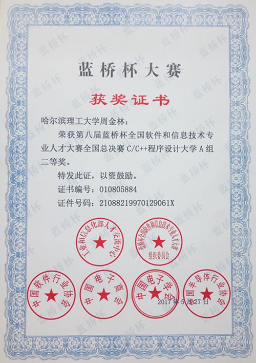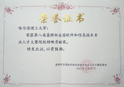 2017年5月28日,第八届“蓝桥杯”全国软件和信息技术专业人才大赛个人赛全国总决赛的颁奖典礼在北京大学落下帷幕。哈尔滨理工大学参赛学生从全国近1200所高校的4万余名参赛选手中脱颖而出,获得全国(A组-重点大学本科组)二等奖的好成绩。同时,我校获得了本届大赛的“年度院校特殊贡献奖”(全国共10所)。