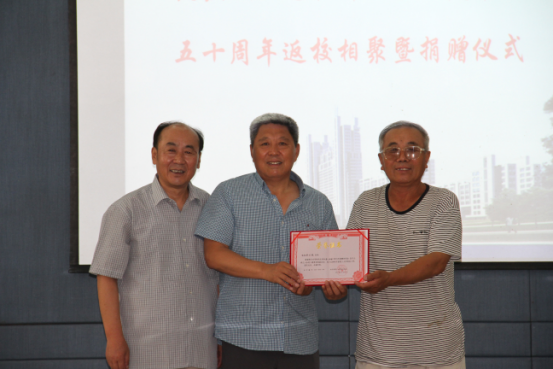 在1号楼第四会议室举行的师生座谈会上,董传友老师代表学校对校友们返校开展纪念活动表示欢迎,对校友们多年来不忘母校恩情,持续关心关注学校发展表示感谢,并祝愿大家健康长寿、晚年幸福。校友代表在发言中纷纷表达了对母校培养的感激之情,表示尽管离开母校50年,但情意从未更改,看到母校的发展变化,大家深感欣慰并衷心祝愿母校越办越好。过程中,校友们向学校教育发展基金会捐赠人民币5000元,校友总会顾问刘君老师代表学校向校友们颁发了捐赠证书。中午,校友与老师们在西区一食堂共进午餐,大家频频举杯,互致祝愿,共同祝福母校能够取得新的辉煌。午餐结束后,校友们在志愿者的陪伴下陆续离开学校,本次纪念活动圆满结束。