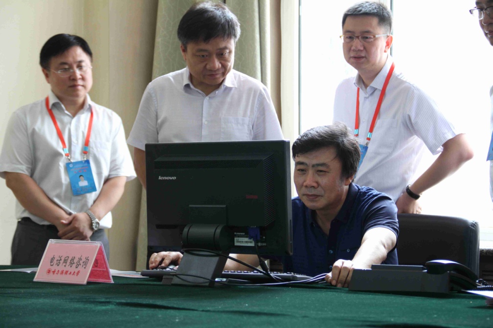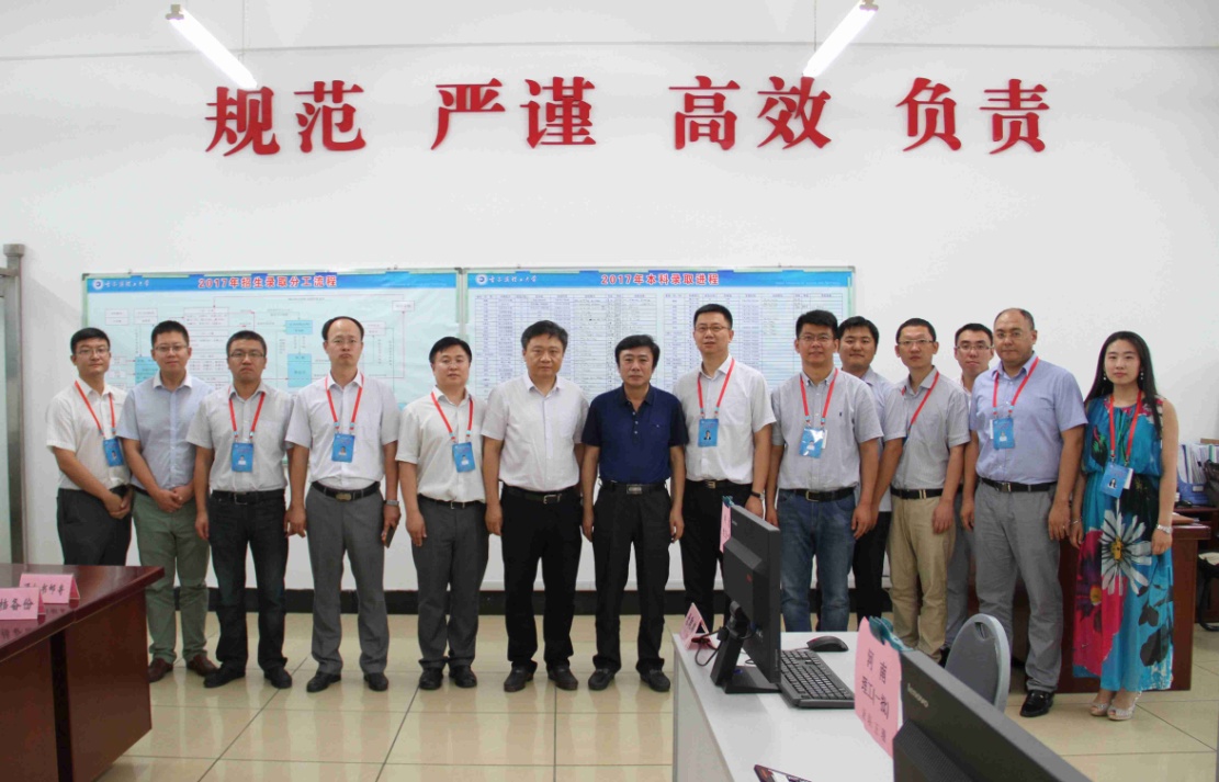 赵国刚书记和王志浩书记首先来到考生咨询接待室,对电话、网络和现场咨询接待工作进行了详细了解,查阅网上答疑情况,尤其对今年增设“考生申诉专线”和“申诉接待席”给予了高度评价,称其为是学校对社会、对考生负责的具体体现。在招生录取现场,赵书记分别对正在进行的内蒙古、上海、山东、广西和陕西等省份的录取情况进行了网上查阅,尤其听取了招生与就业工作处处长王琦关于广东省计划调整和借助校友与在校生资源确保计划完成有关情况的汇报。赵书记指出:按照中央总体部署,黑龙江省与广东省(哈尔滨市与深圳市)彼此结对子,为更好贯彻落实中央部署和省十二次党代会精神,学校在今年5月成功举办“哈理工校友深圳名优企业行”活动,助力深圳市企业与哈尔滨间交流的基础上,进一步增大在广东省的招生计划,同时经过努力争取,实现了校本部全部专业在广东一批次招生,现已成为在广东省招生的黑龙江省院校中计划数最多的高校,落实上级精神的同时,更提高了生源质量。可以预见,这些来自发达地区的考生,也一定会在丰富校园文化、促进两地交流方面发挥出作用。为确保招好、招足、招实的工作目标,招生就业处(校友办)广泛发挥广东校友和在校广东籍学生作用,与区域内高中逐一建立联系,通过广东省各地校友会深入高中建立联系,最大程度地整合调动了资源,为计划的完成奠定了基础。在征集志愿前,又及时发动有联系高中的老师和预录取新生,推送征集志愿信息,扩大学校在考生中的影响,最终圆满完成广东一批次计划。这些做法和努力都是对工作和岗位负责,不断创新、善于攻坚、担当面对的具体体现,值得肯定和推广。关于招生录取流程的规范梳理,赵书记再次给予了好评,称其是精细化管理的现实案例。过程中,赵书记着重强调了招生录取和信息安全的重要性,同时进一步明确了工作要求。