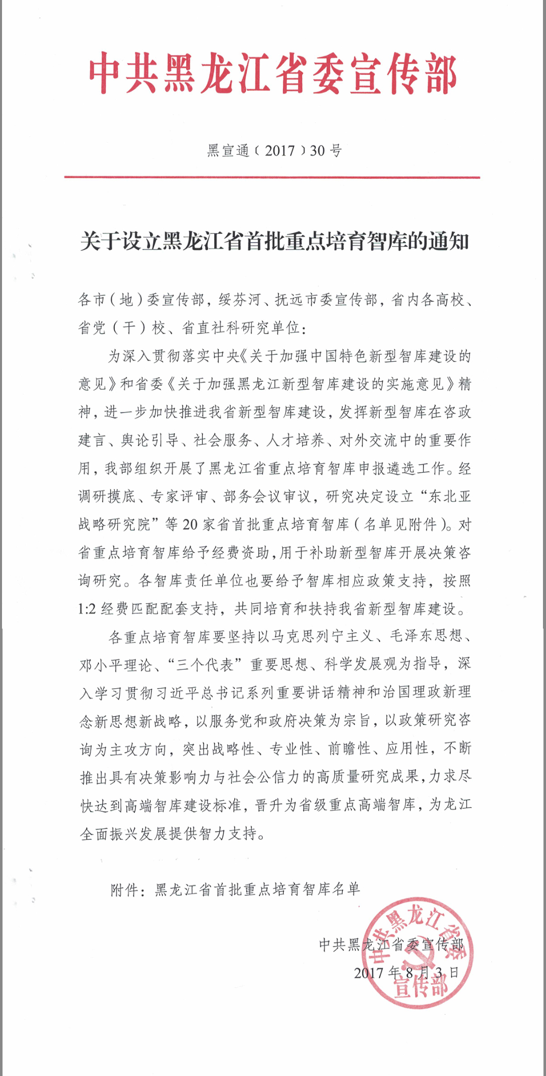 为深入贯彻落实中共中央办公厅、国务院办公厅《关于加强中国特色新型智库建设的意见》和黑龙江省委省政府《关于加强黑龙江新型智库建设的实施意见》,进一步加快推进黑龙江省新型智库建设,黑龙江省委宣传部哲学社会科学规划办公室按照《关于组织申报黑龙江省重点培育智库的通知》要求,组织开展了黑龙江省重点智库培育申报遴选工作,经过摸底调研、专家评审、会议答辩,报领导批准,决定在全省设立20家省首批重点培育智库。其中,我校以王志浩、陆岩教授为首席专家的“黑龙江省人口经济与人才发展战略研究中心”成功入选。