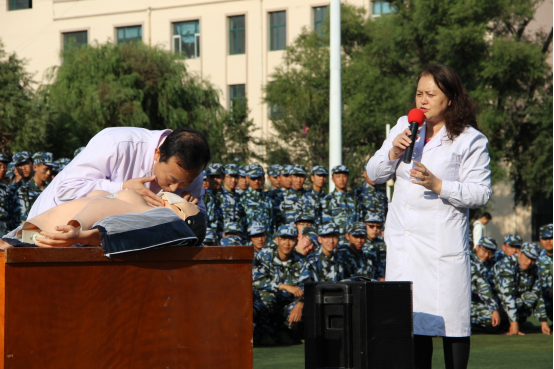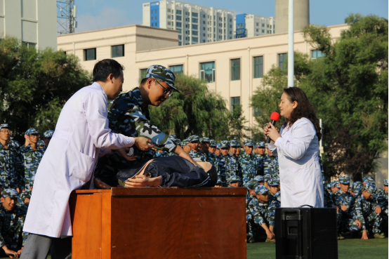 当日下午,我校医生在军训场上为新生们讲解急救知识,使得学生们掌握基本的急救知识和技能。
