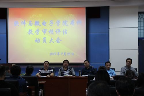 9月25日中午,软件与微电子学院在东区一字楼301会议室召开了全院本科教学审核评估动员大会。院长张宏国、党委书记肖庆生、党委副书记刘志勇、副院长李鹏、副院长黄海出席会议,学院全体教职工参加会议,会议由张宏国院长主持。