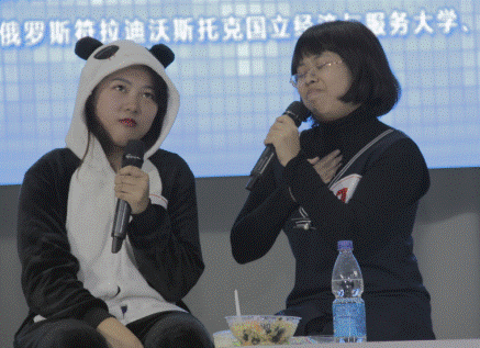 我校选手卜晴晴(左一)和黑大选手合作演绎《熊猫功夫》片段