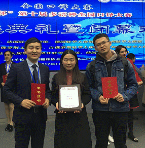 我校三届全国口译大赛选手齐聚闭幕式(左起14级胡东升,13级刘畅,12级费猛)
