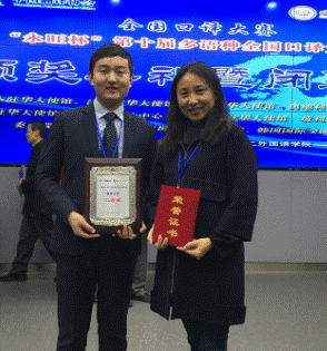 领队教师外国语学院副院长常颖教授和获奖选手胡东升