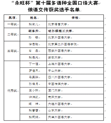 本次大赛通过网络初赛,进入复赛的有来自全国45所高校的99名选手参赛,其中俄语交传组有来自北京外国语大学、上海外国语大学、四川外国语大学、西安外国语大学、大连外国语大学、天津外国语大学、南开大学、厦门大学等15所高校的选手。哈尔滨理工大学是唯一一所入围复赛的理工科院校。经过激烈的角逐,15进6,我校选手胡东升成功晋级决赛。决赛中胡东升同学翻译精准、沉稳,表现出优秀的翻译综合素质。