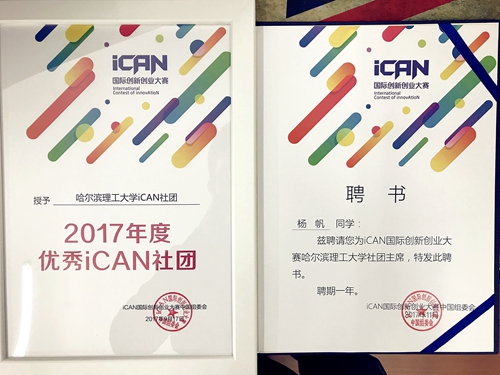在iCAN国际创新创业大赛十周年之际,大赛组委会授予自动化学院徐军教授“iCAN教育之星”称号,授予自动化学院17级控制工程专业研究生杨帆同学“iCAN创新之星”称号;在比赛期间杨帆同学作为大赛学生代表接受北京电视台的现场采访,与现成多家企业交流,为我校争得荣誉;同时,大赛组委会授予哈尔滨理工大学iCAN社团为“2017年度优秀iCAN社团”,为杨帆同学颁发了哈尔滨理工大学iCAN社团主席的聘书,并任命杨帆同学为黑龙江省高校iCAN社团总负责人,杨帆同学代表学校在iCAN青年创新联盟开幕式发言。