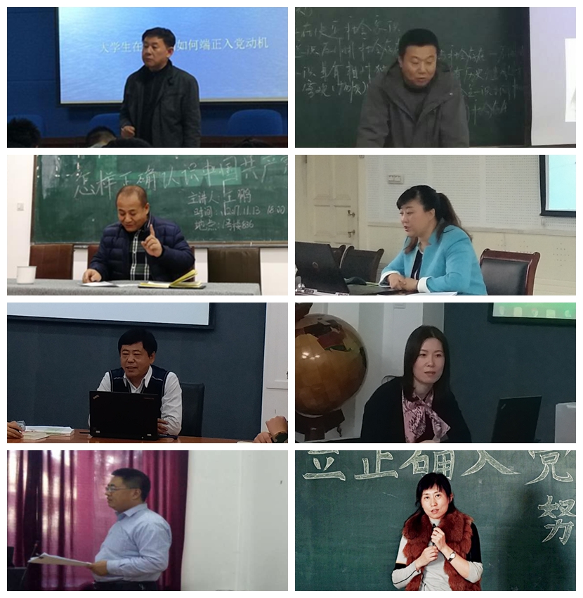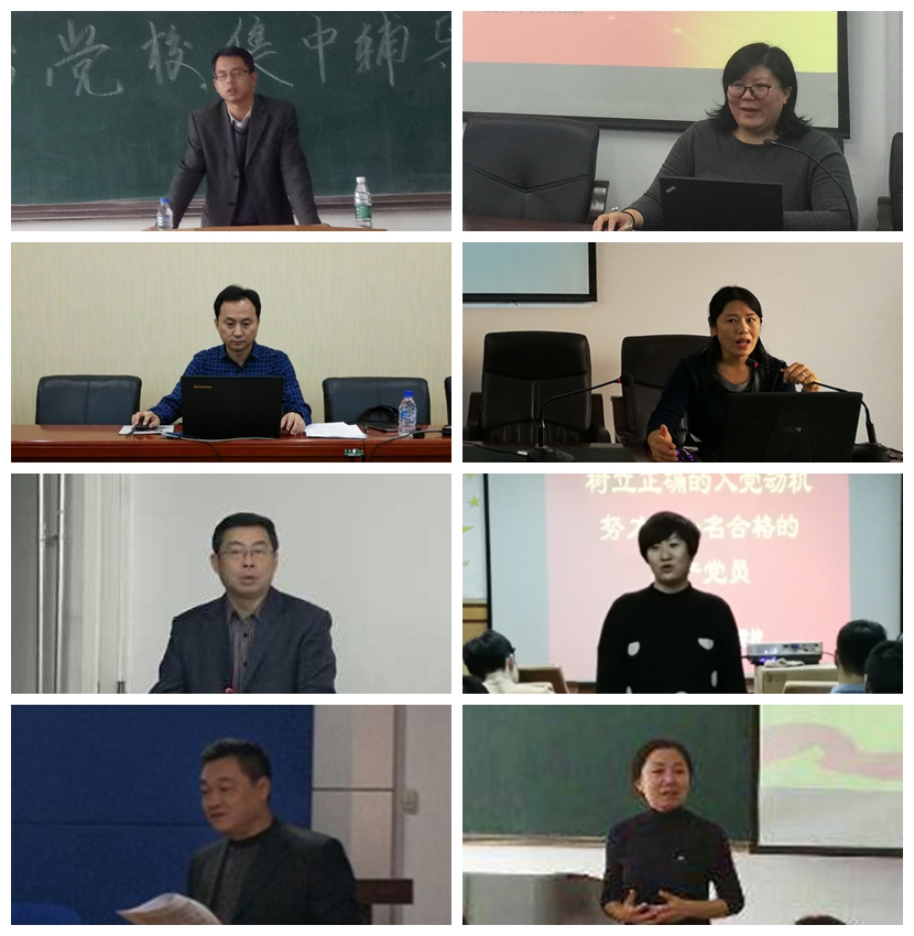 全校集中辅导环节,邀请校党委副书记、党校校长陆岩以《党员的权利与义务》为主题对党校学员进行专题辅导。主要从深刻理解学习十九大以来修改《中国共产党党章》的重大意义,中国共产党党员必须履行的八项义务,中国共产党党员享有的八项权利以及敢担当善作为做“四讲四有”合格共产党员等四个部分,为学员们讲授了党章的相关知识;党委常委、校纪委书记王志浩围绕党的十九大精神:“不忘初心牢记使命 勇于担当 放飞梦想”进行深入细致的解读,并对新一批预备党员作出了具体要求;黑龙江省委党校的麻秀荣教授专题授课,为学员讲授了学习党的基本理论,牢记党的根本宗旨;黑龙江省委党校党史党建教研部讲师宋庆森以新时代、新思想、新战略、新要求——党的十九大报告学习体会进行讲解;黑龙江省委党校党史党建教研部讲师谢炜围绕中国共产党党员的义务和权利进行辅导;建筑工程学院党总支书记戴湘竹以“如何发挥积极分子的模范带头作用”对新一批积极分子做出了要求;学生处处长杨忠学为预备党员做题为《牢记使命,做新时代中国青年的楷模》的报告;校团委书记姜国玉做了《新时代新青年的新方位新作为——不忘初心跟党走青春共筑中国梦》的报告。