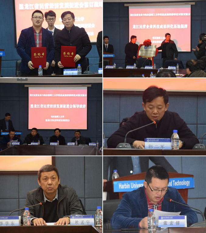 为进一步贯彻落实党的十九大精神,深入学习并落实中共黑龙江省委书记、省人大常委会主任张庆伟同志来视察学校时的讲话精神,有效推动高校科技成果向民营企业转移转化,促进民营企业技术创新改造、转型升级,实现科技与产业高效对接,2017年12月27日,哈尔滨理工大学与黑龙江省民营经济发展促进会在我校一号楼第四会议室联合举办《哈尔滨理工大学与龙江民营企业科技成果转移转化对接交流会》暨“龙江民营科技成果转移转化基地”揭牌仪式。