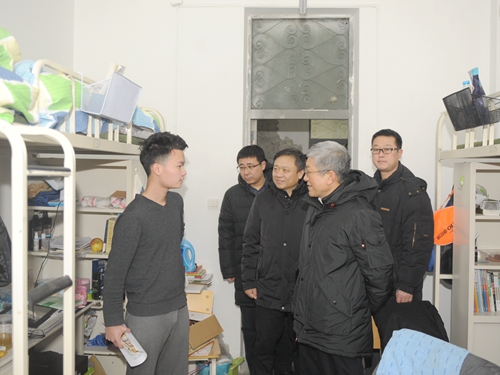 1月11日上午,校长李大勇、纪委书记王志浩带队检查校园安全情况,校领导一行走访了东区、南区、西区等三个校区的消防安全重点单位和隐患区,慰问一线工作人员,听取各单位安全工作负责人的工作汇报,对寒假及春节期间的安全工作提出指导意见。后勤管理处处长安文斌,保卫处处长范洪涛、副处长张路杨,学生处副处长蔡野等陪同走访。