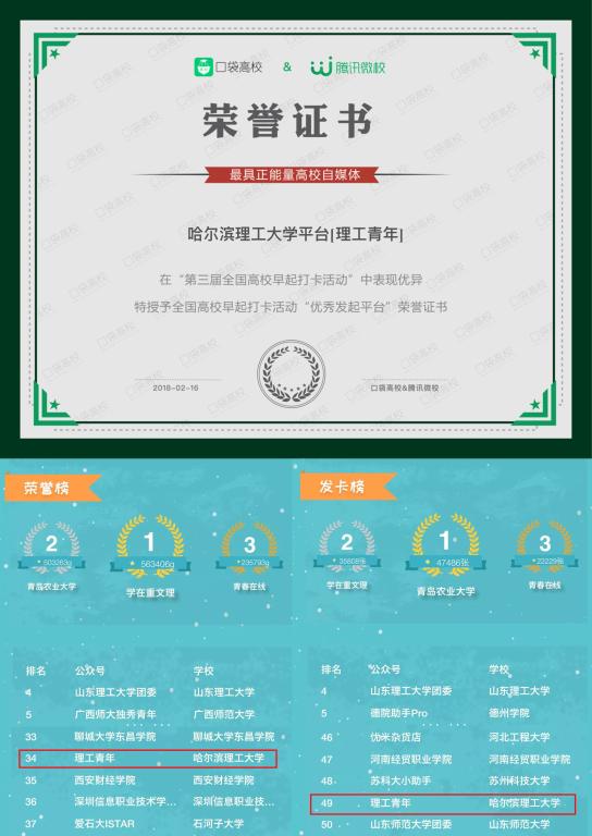 2月18日,我校在“第三届全国高校早起打卡活动”中表现优异,被授予全国高校早起打卡活动“优秀发起平台”荣誉证书。本次活动历经26天,共计30万+大学生参与到了本届打卡活动,进行了102万次打卡,写下12.5万条寒假心情日记,活动影响覆盖全国2169所高校。我校在第三届全国高校早起打卡活动最终榜单中作为黑龙江省唯一入榜高校,分别名列全国荣誉榜第34名和全国发卡榜第49名。本次活动是我校“晨曦行动”在寒假期间的进一步延展,帮助我校学生加强自我管理、自我教育的能力,养成良好的假期生活学习习惯。