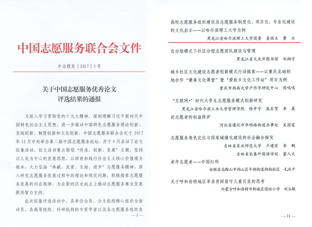 1月8日,在中国志愿服务联合会、中国志愿服务基金会共同主办的2017年第二届中国志愿服务论坛优秀志愿服务论文征集活动中,我校团委姜国玉、曹石撰写的论文《高校志愿服务组织建设及志愿服务制度化、项目化、专业化建设的文化启示——以哈尔滨理工大学为例》获得三等奖。本次征集评选活动经单位会员、分支机构精心组织全面动员,各高等院校、科研机构的专家学者以及志愿服务组织负责人、志愿服务骨干积极响应踊跃参与,共选报492篇论文参加评选。本着“公平、公正、公开”和择优原则,依据《优秀志愿服务论文评审标准》,专家评审组认真进行了初评、终评,经评审委员会审定,共评选出优秀论文65篇。