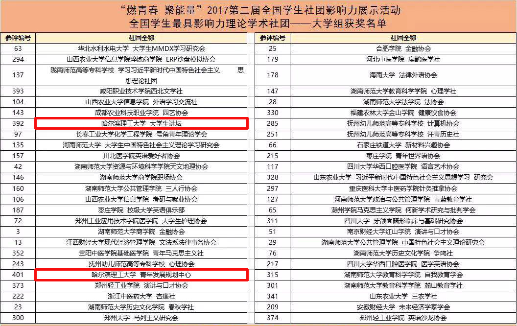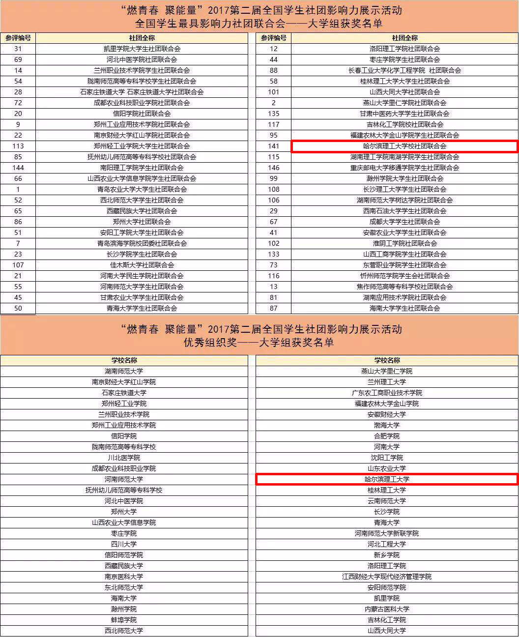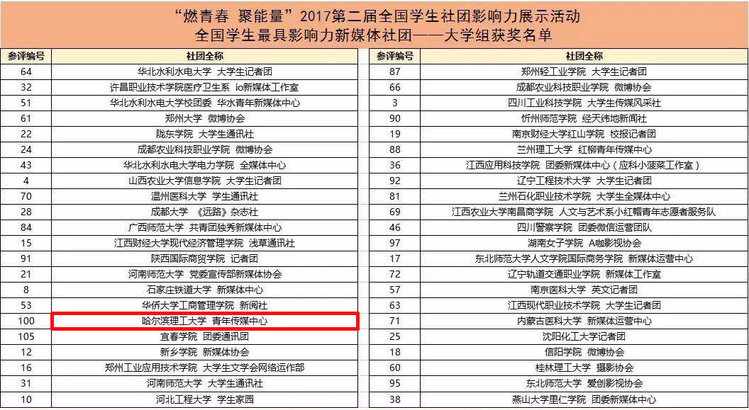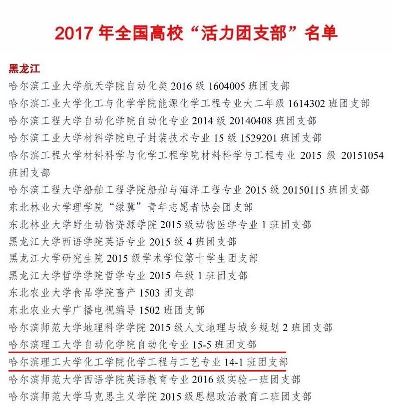 3月1日,2017年全国高校“活力团支部”创建遴选活动评选结果公布,我校自动化学院自动化专业15-5班团支部、化工学院化学工程与工艺专业14-1班团支部成功入选,荣获全国“活力团支部”称号,黑龙江省共有35个团支部获此荣誉。近年来,校院两级团组织深入实施基层团支部“活力提升”工程,组织基层团支部开展各类主题团日活动,选拔树立了一批优秀集体和个人典型,并通过这些集体和个人引领广大同学坚定理想信念,志存高远,脚踏实地,为学校“十三五”规划发展和“双一流”建设贡献青春、智慧与力量。此外,在刚过去的寒假里,我校捷报频传,多名师生和多个集体在全国大学生学习宣传贯彻党的十九大精神网络接力活动、全国学生社团影响力评选展示活动、全国高校早起打卡活动、全国普通高校团委微信公号综合影响力排行、全国学校共青团2018年学术年会“入选论文”评选和中国志愿服务论坛优秀志愿服务论文征集活动等多个全国性评选活动中喜获佳绩。