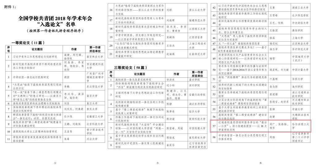1月16日,共青团中央学校部,全国学校共青团研究中心,中国青少年研究会联合公布了全国学校共青团2018年学术年会“入选论文”评选结果,我校电气学院周广、张路杨、杨芳撰写的论文《打通高校基层团组织服务学生的“最后一公里”:团小组建在寝室——以H大学某学院为例》获得三等奖。全国学校共青团学术年会是由共青团中央学校部、全国学校共青团研究中心主办,本届共有参选论文500多篇,来自全国各大高校、共青团机关、研究机构和普通中学等,经过遴选、审核和专家盲审、评选,本次共有187篇论文入围。