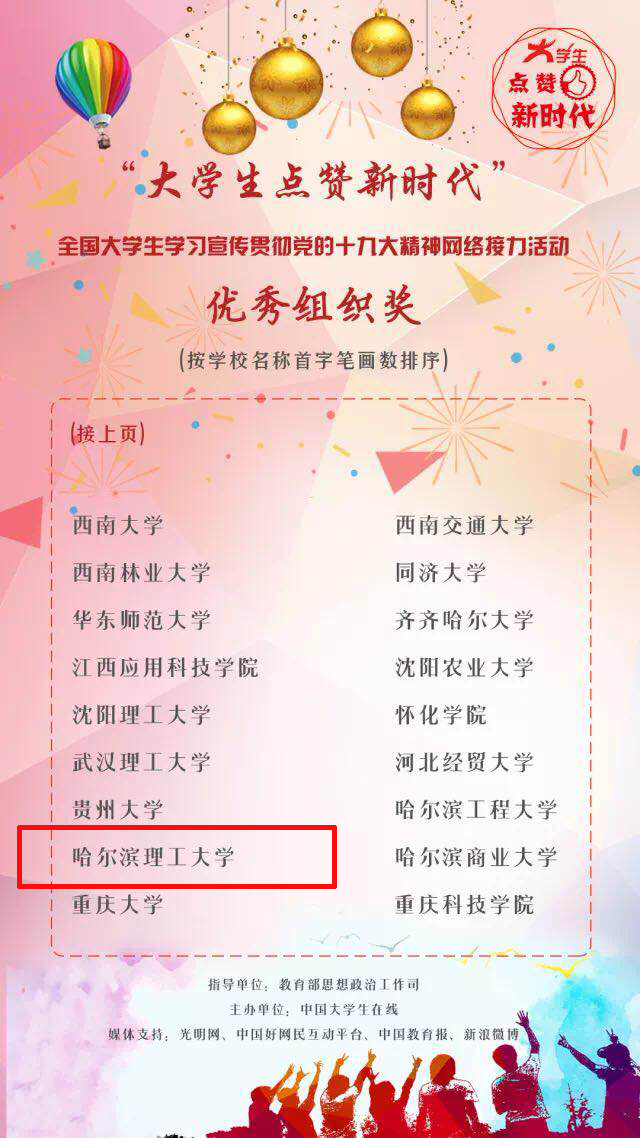 3月1日,由教育部思想政治工作司指导,中国大学生在线主办的“大学生点赞新时代”全国大学生学习宣传贯彻党的十九大精神网络接力活动圆满收官,我校获得“优秀组织奖”!通过本次活动反映了我校青年学子学习宣传贯彻十九大精神的最新动态,进一步将我校学习宣传贯彻十九大精神引向深入,引导广大青年学生自觉用习近平新时代中国特色社会主义思想武装头脑,不忘成长初心,牢记时代使命,在实现中国梦的生动实践中放飞青春梦想,在为人民利益的不懈奋斗中书写人生华章。