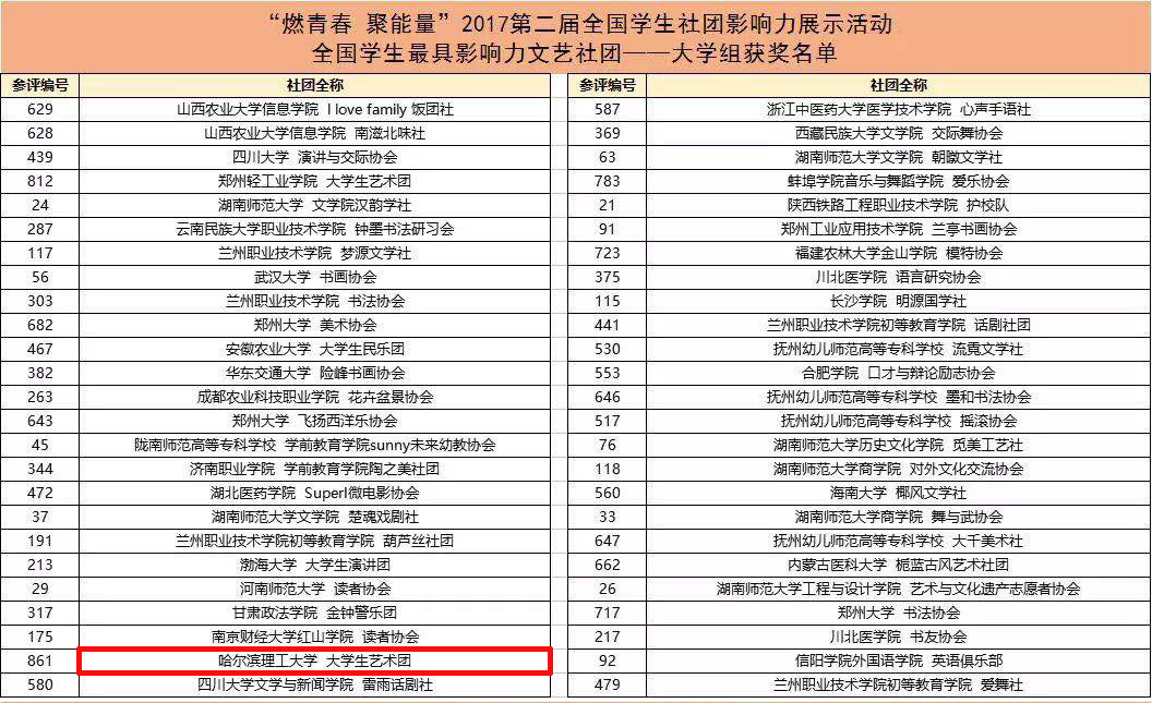 1月30日,在“燃青春 聚能量”2017第二届全国学生社团影响力评选展示活动中,我校学生社团联合会荣获“全国学生最具影响力社团联合会”称号;校大学生艺术团荣获“全国学生最具影响力文艺社团”称号;校青年传媒中心荣获“全国学生最具影响力新媒体社团”称号;校青年发展规划中心、校大学生讲坛荣获“全国学生最具影响力理论学术社团”称号,我校荣获“优秀组织奖”。本次活动以“青春瞩目十九大 燃青春 聚能量”为主题,历时三个月,全国近千所院校的8000多个社团参与评选。活动采取网络展示阶段、技术审查、以及人工审核等方面综合评定等环节,最终由专家评委对排名进行综合评定。近年来,我校学生社团保持了良好的发展态势,现有注册学生社团119个,学校对学生社团积极鼓励、正确引导,采取有效的工作措施,使学生社团成为提高学生综合素质、促进学生全面发展的重要渠道,在凝聚青年学生、繁荣校园文化、培养学生实践能力等方面发挥着重要作用。