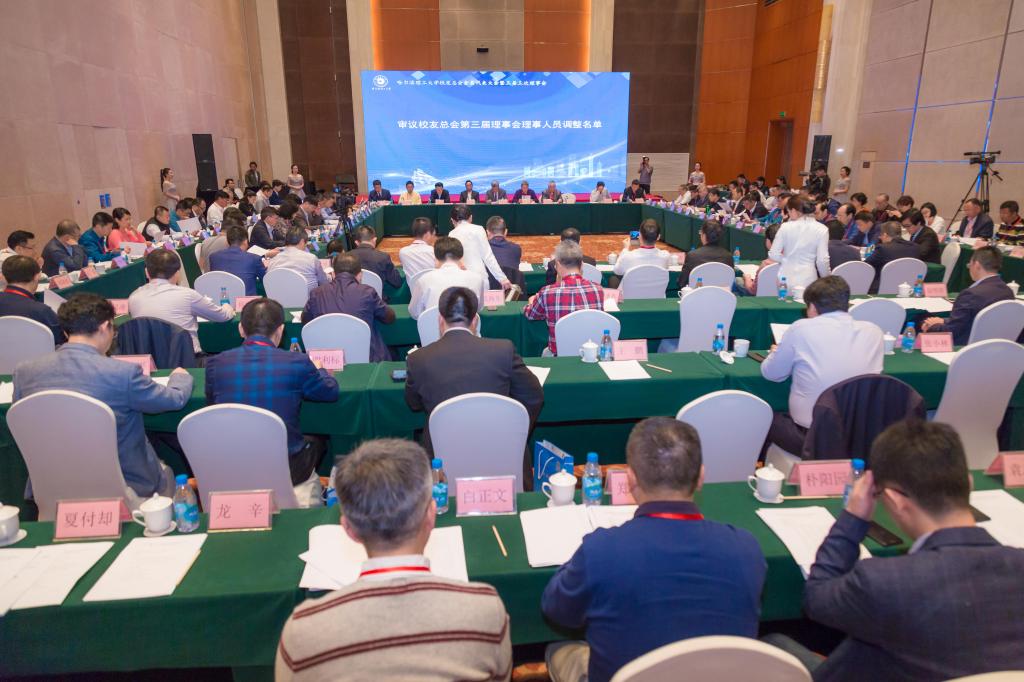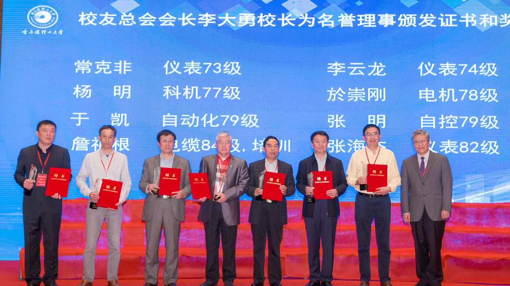 会议聘任李云龙(仪表74级)、于凯(自动化79级)、张海杰(仪表82级)、杨明(科机77级)、於崇刚(电机78级)、詹祖根(电缆84级培训)、常克非(仪表73级)和张明(自控79级)8位在三届理事会期间为校友会建设和校友工作作出突出贡献的校友为名誉理事,李大勇校长为他们颁发了聘书和奖杯,名誉理事逐一发表感言,李云龙校友作为代表最后讲话。在讲话中,李云龙校友感慨到:“自六十年校庆开始,特别是2014年以后,我们理工大学校友会如雨后春笋蓬勃发展,这次会议的召开和理事会规模的扩大更充分说明了这一点,这样良好的发展状况和态势可谓形势喜人。究其原因主要有三点:一是得益于李大勇校长全面的教育观、质量关和发展观,他把考生的愿望、学生的成绩和校友的业绩融为一体,纳入学校总体的战略和战术中去,通过校友会的蓬勃发展,真正实现了校外促校内,推动了三校真正的融合、融洽与和谐发展,这是一件功在当代、利在千秋的历史性功绩;二是得益于以王琦为代表的校友办的同志们和“校友之家”的在校学生们,由于他们发挥了很好的桥梁纽带作用、发挥了很好的为校友服务的作用,呕心沥血,百般努力,使我们的校友总会和各地校友会凝聚力和感召力越来越强,我们非常感谢王琦的团队为校友工作的蓬勃发展和母校的建设做出的突出贡献;三是得益于我们全体哈理工校友永远不变的、孜孜以求的校友情怀,我们虽然专业不同,届别不同,但是哈理工这个名字把我们所有人紧紧联系在了一起,这份学子情怀,应该是学校发展所必须、也是学校发展的力量所在。