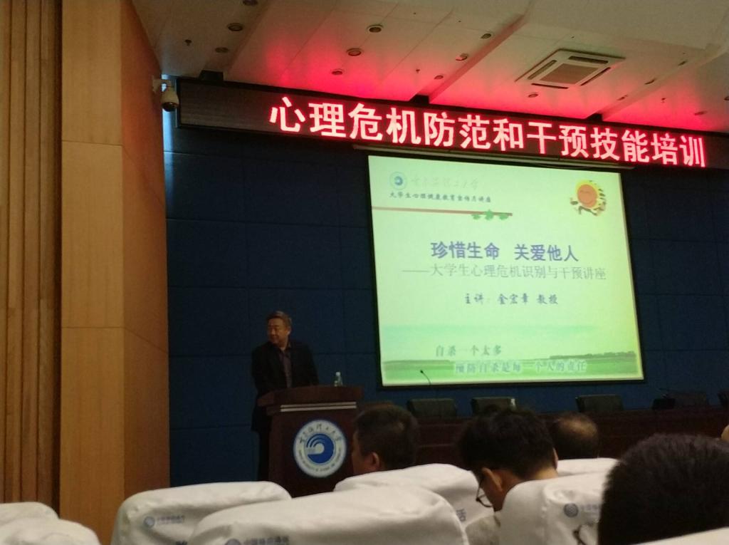 为建立校园心理危机早教育、早预防、早发现、早干预的“四早体系”,提高学生工作人员对大学生心理危机的识别与干预技能,4月26日下午在新主楼的5楼报告厅,学生处组织举办了“心理危机防范和干预”技能培训讲座。培训由哈尔滨工程大学人文学院金鸿章教授主讲,全体学生工作人员和部分学生干部、班级心理委员参加了培训。