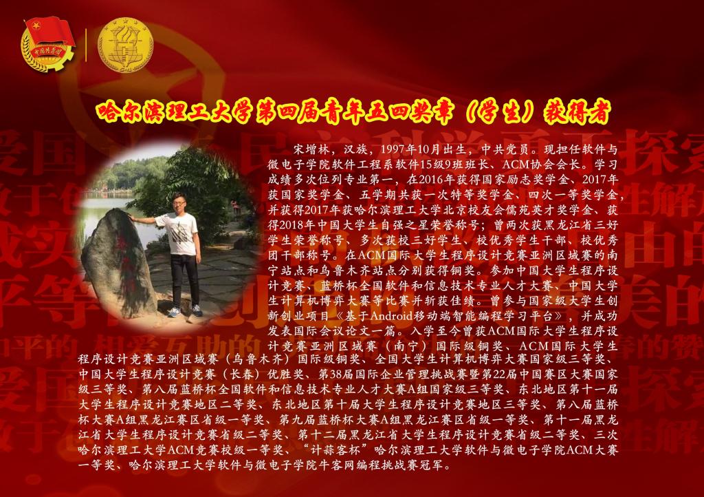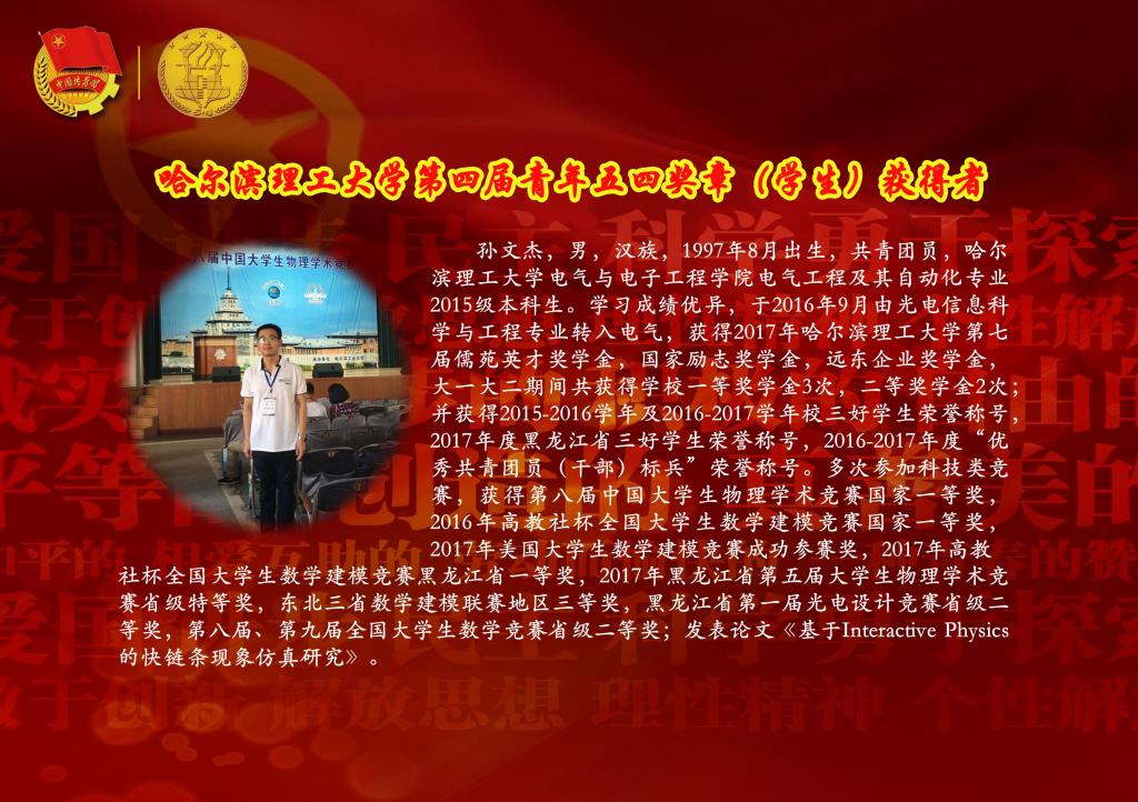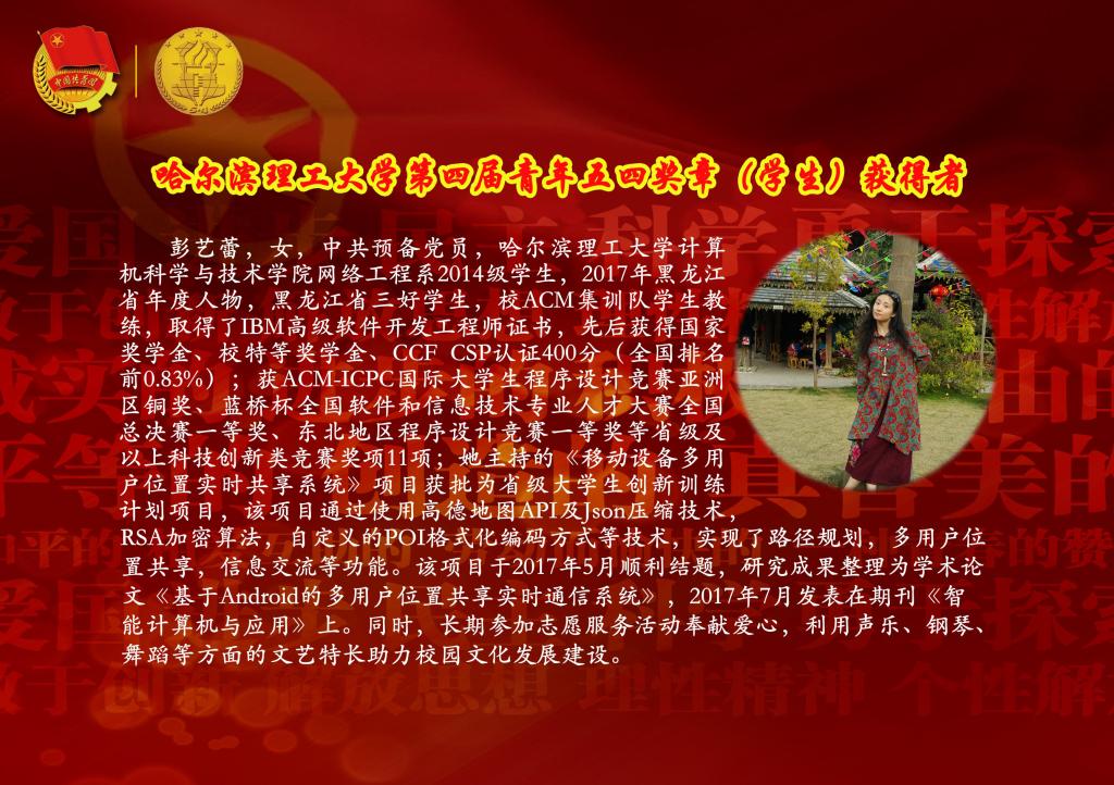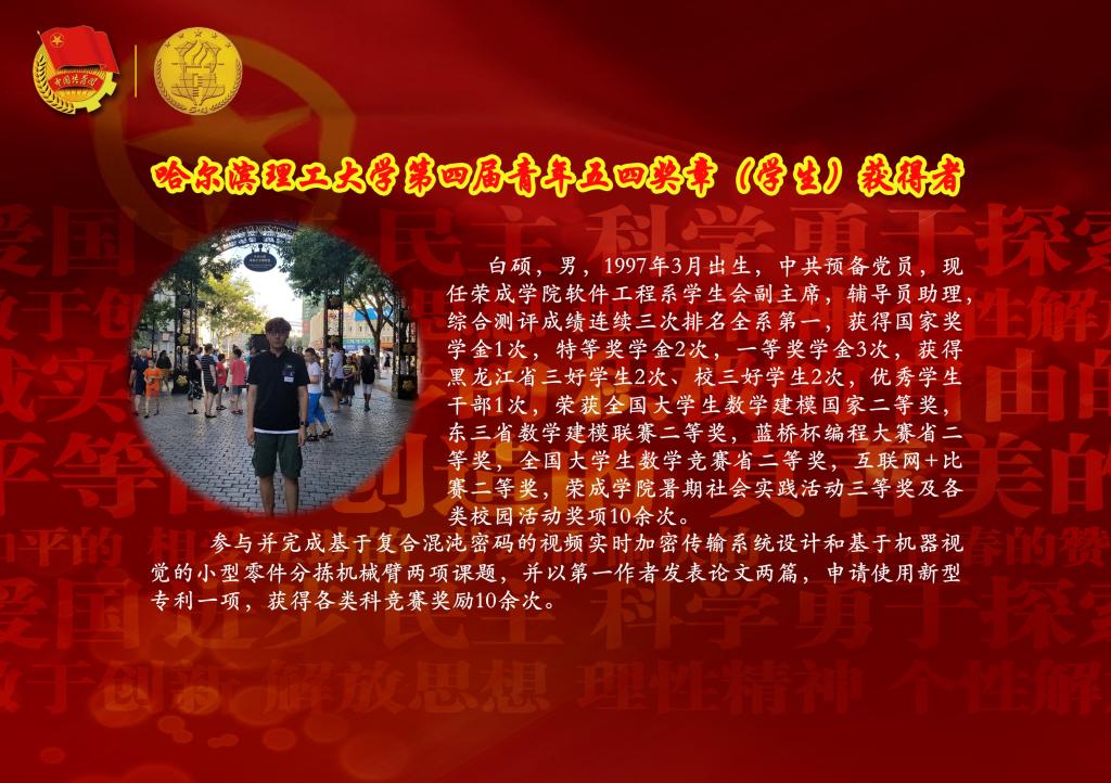 编者按:一百年前,鲁迅先生寄语中国青年:此后若没有炬火,我便是唯一的光。国破危亡之际,为真理正义披荆斩棘,为对抗封建糟粕视死如归,“五四”运动力挽狂澜。从此,青年,崛起!一百年后,习近平总书记厚望当代中国青年:要爱国,忠于祖国、忠于人民;要励志,立鸿鹄志、做奋斗者;要求真,求真学问、练真本领;要力行,知行合一、做实干家;要有社会主义建设者和接班人的使命担当。奋斗是青春的底色,行动是最好的传承。弘扬“五四”精神、鼓舞青年斗志离不开榜样的力量。在纪念五四运动99周年之际,我校又涌现出一批“哈尔滨理工大学青年五四奖章”获得者。他们信念坚定、脚踏实地、奋发进取,展现了理工青年的时代风貌和价值追求。今天,让我们再次走近这些身边的优秀青年,一起向奋斗的青春致敬,以榜样的力量激励和引导我校广大青年为强校建设奉献青春智慧和力量。