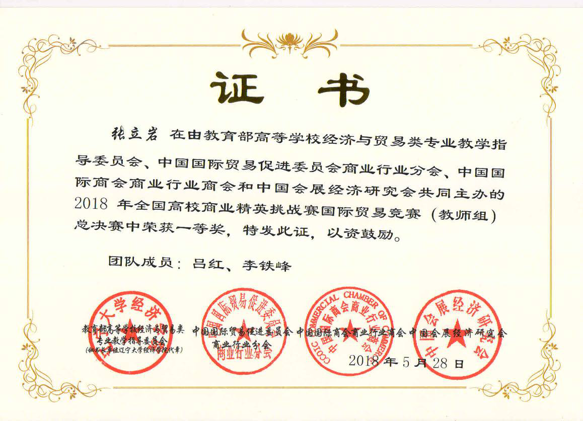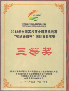 2018年5月24日至28日,2018年全国高校商业精英挑战赛“智欣联创杯”国际贸易竞赛总决赛在浙江省宁波市举行。本次竞赛由中国贸促会商业行业分会、教育部高等学校经济与贸易类专业教学指导委员会、中国国际商会商业行业商会和中国会展经济研究会联合主办,并由(国资委)商业国际交流合作培训中心、中国贸促会宁波市委员会、中国贸促会杭州市委员会、中国贸促会南京市分会、中国贸促会山东省委员会贸易投资服务中心等联合协办的国家级、国际性的学科竞赛,是2018年中国国际经贸教育创新实践活动周的主体活动。我校经济与管理学院代表队凭借参赛作品“四月茶侬”获得三等奖的成绩;由国际经济与贸易系教师张立岩、吕红、李铁峰组成的教学团队在国际贸易课程设计竞赛(教师组)总决赛中,获得团体一等奖;张立岩荣获“十佳教师”的称号。