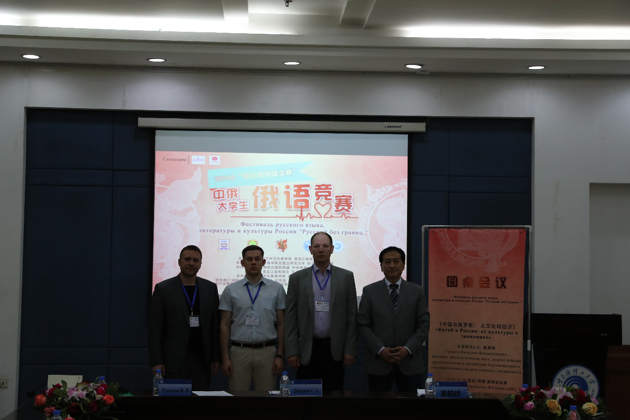 作为赛事活动的重要组成部分,圆桌会议《中国与俄罗斯:从文化到经济》与《中俄青年:我们的未来》于5月31日下午17点30分至18点30分在哈尔滨理工大学西区1号楼第四会议室与第三会议室举行。国际文化教育学院院长兼国际合作与交流处处长姜毓锋教授,外国语学院副院长(主持工作)甄艳华教授分别在会议上致辞,来自俄罗斯与中国各大学的教师、俄语爱好者参加了圆桌会议的讨论。