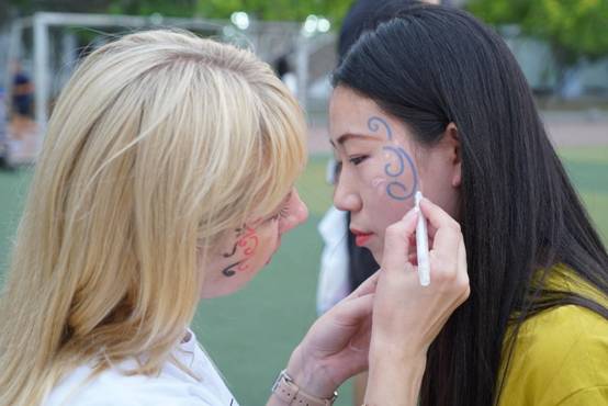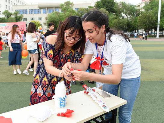伴随着优美的演出,俄罗斯艺术大师领着我校师生及感兴趣的市民一起制作仪式用布偶,进行手工编织,制作太阳护身符,彩绘,用纱线制作帽形坠,制作小鸡和麻雀线偶。俄罗斯游戏现场也十分热闹,中俄两国青年一起完成各式有趣的俄罗斯民间游戏。舞台演出、手工制作、民间游戏拉近了中俄双方参与者的心,整个西区操场都洋溢着中俄友谊的美好乐章。