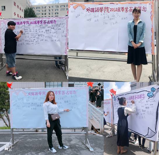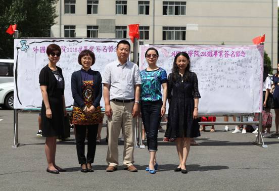 为响应学校对于毕业生安全文明离校的号召,让毕业生离校不离心,6月20日10时,外国语学院在南区图书馆门前举办欢送2018届毕业生签名留印活动。党委书记高秀江、院长甄艳华、党委副书记周晓丽、副院长常颖、副院长马艳辉、各系部主任和部分教师代表出席了本次活动。