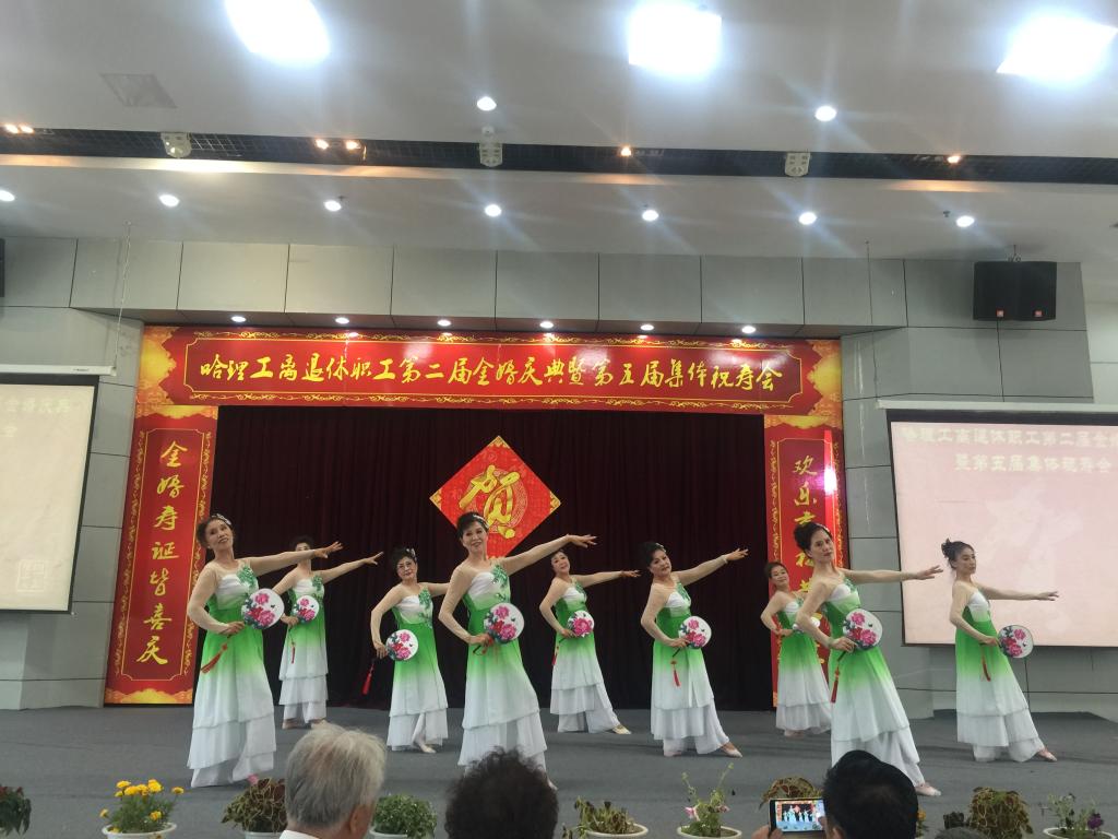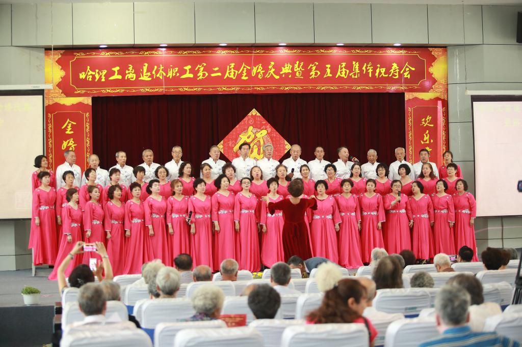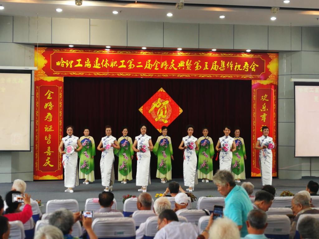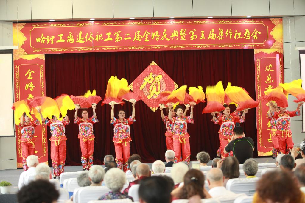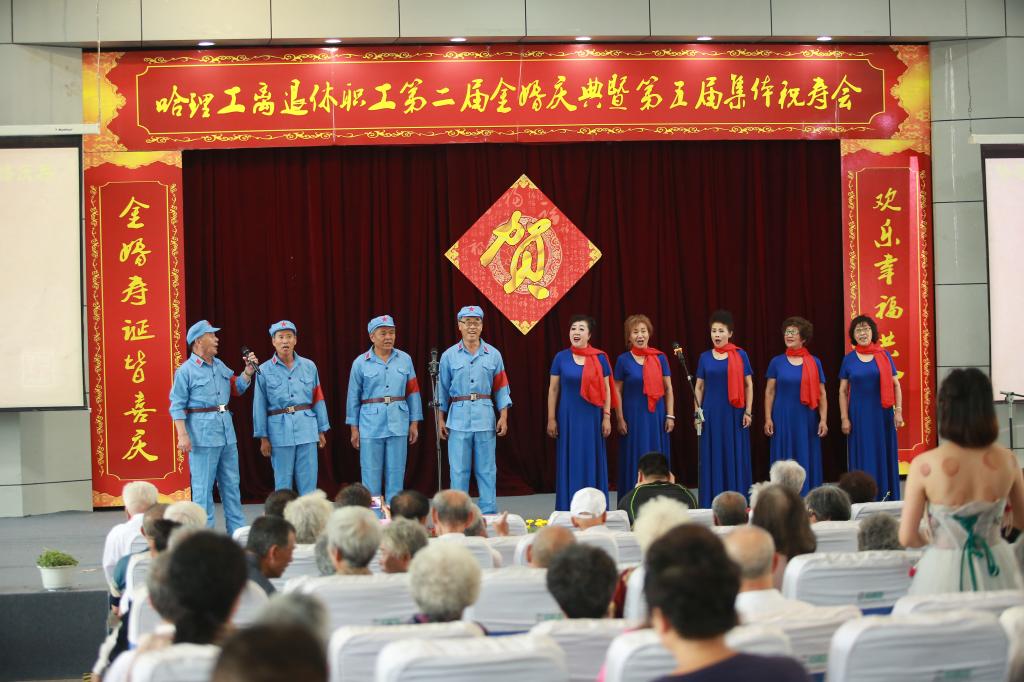 庆典仪式后,老年学院学员们为金婚夫妇、寿星们献上了一台精彩的文艺演出,祝福老同志们身心健康,阖家幸福。舞蹈《欢聚一堂》、女生独唱《您是我的幸福、我的荣光》、模特表演《浪漫夕阳》、小合唱《青松林内红旗扬》、柔力球表演《相信》,舞蹈《茉莉花》大合唱《十送红军》《北京金山上》一次次将现场气氛推向高潮,为理工金婚夫妇、老寿星们提供了一次丰富的精神盛宴。