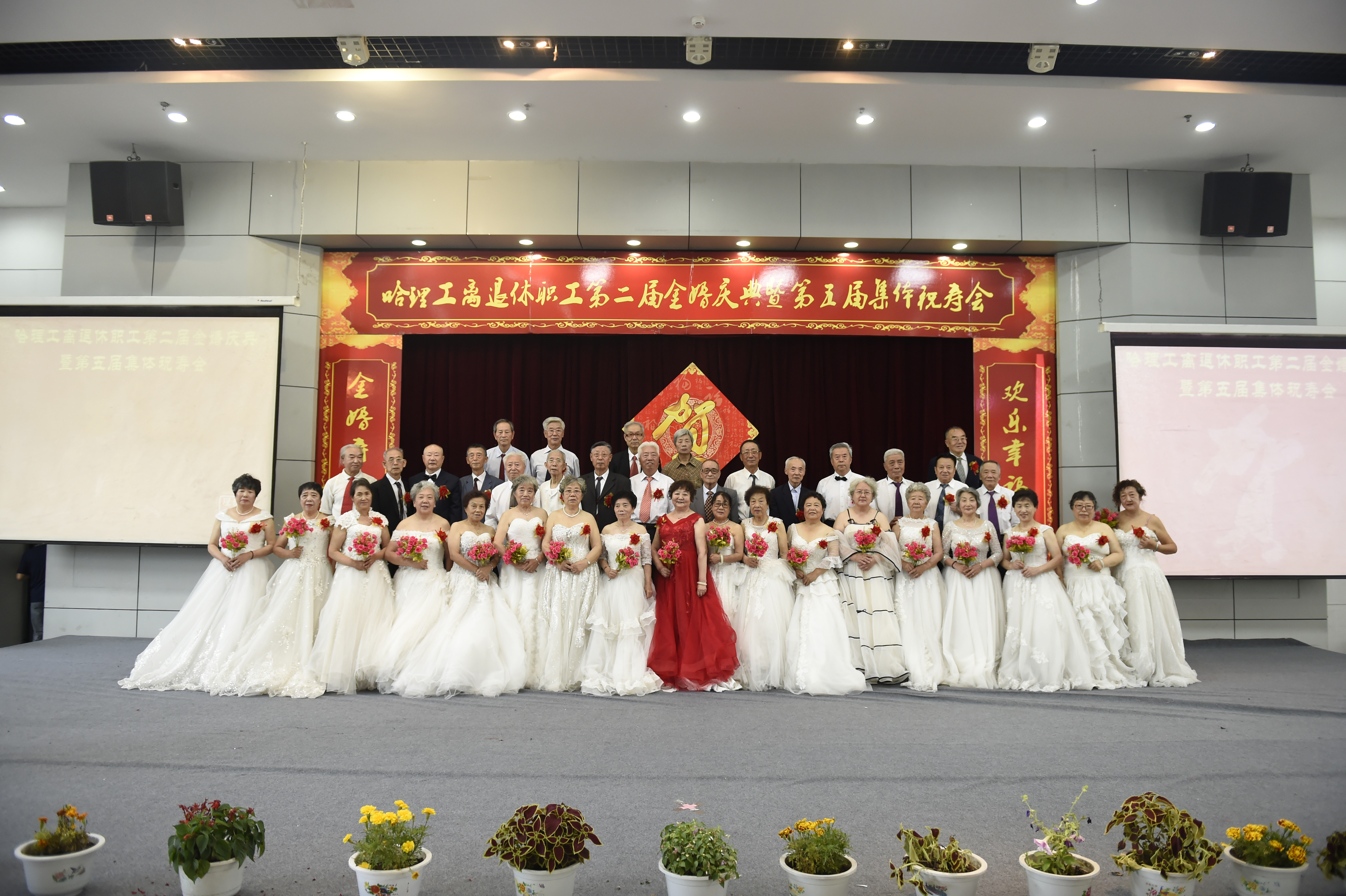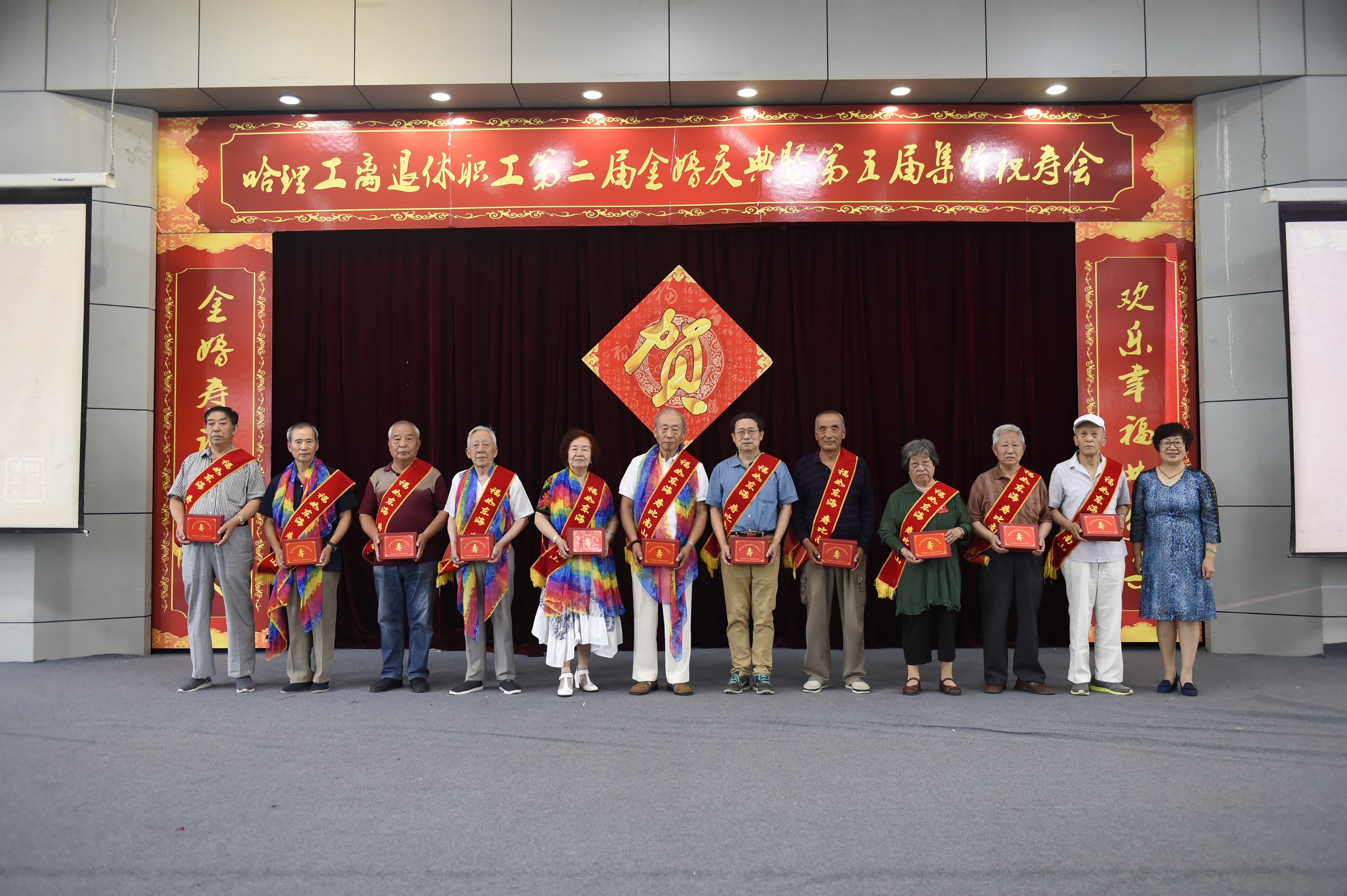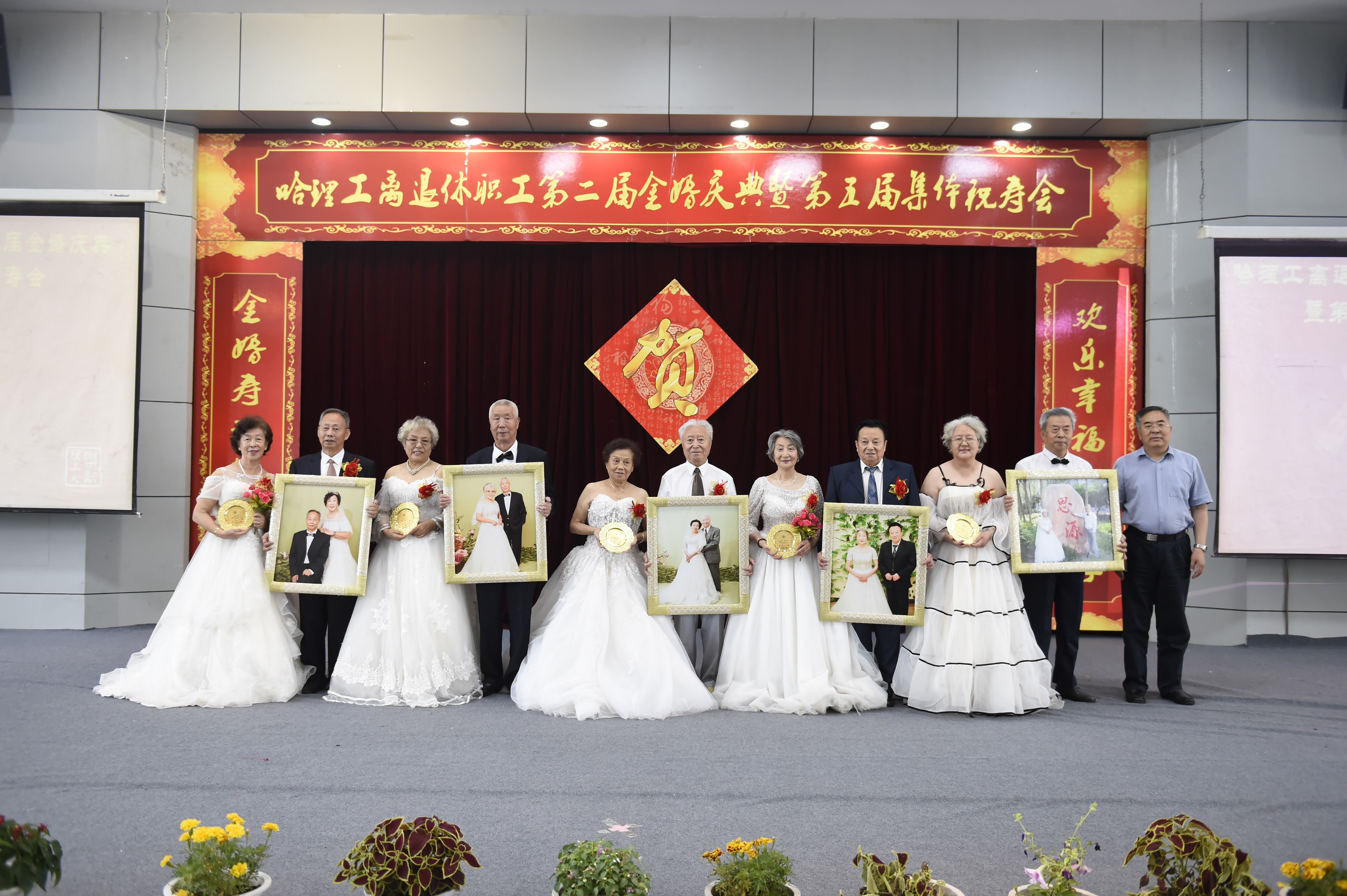 金婚寿诞皆喜庆,欢乐幸福共分享。7月5日上午,哈理工离退休职工第二届金婚庆典暨第五届集体祝寿会在一号楼二楼报告厅举行。携手走过半个世纪的一对对银发伉俪在婚礼进行曲和阵阵掌声中,手挽手,踏着红色地毯,穿过拱形花门,激动地走向会场。全校70、75、80、85、90、95岁的寿星们个个精神抖擞,神采飞扬,按年龄段上台合影,会场热闹喜庆非凡。校党委书记张洪涛教授、副书记陆岩教授到场为62对金钢婚、绿宝石婚、金婚夫妇、235位寿星送祝福。