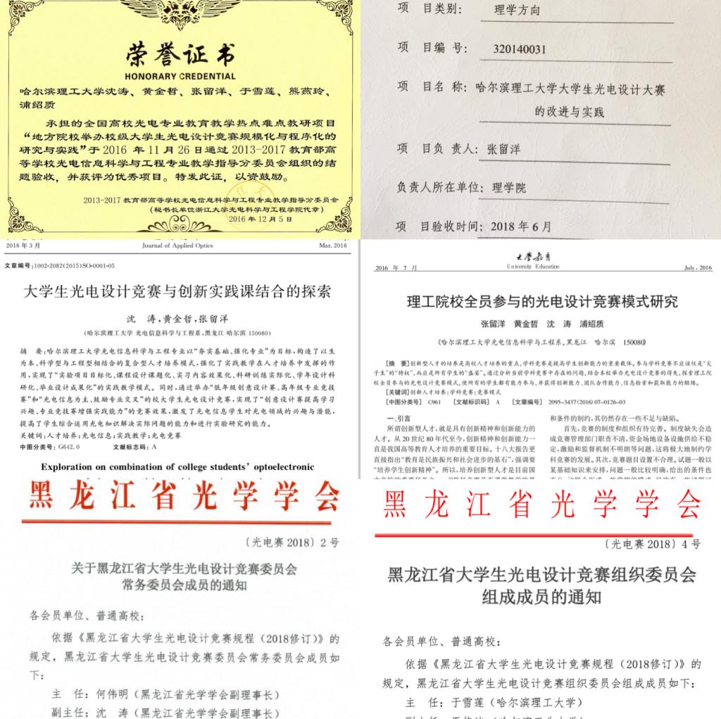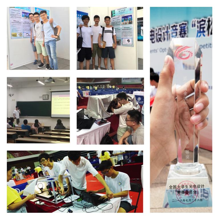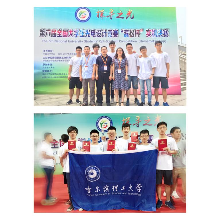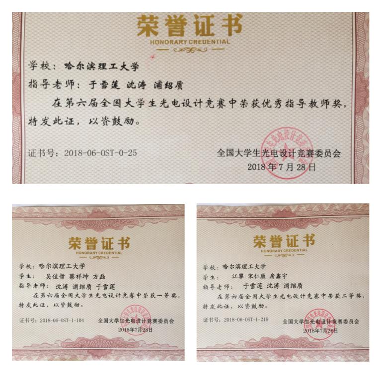 在学校领导、教务处、理学院和兄弟院系的大力支持下,在于雪莲、沈涛、浦绍质等指导教师团队对学生常年如一日的悉心指导下,我校派出的两支参赛队,经过校赛推荐、省赛PK、东北地区赛选拔、国赛现场比拼等环节,参赛学生经过刻苦钻研,围绕比赛题目进行了实验方案的反复设计和改进,建立了创新性的理论模型和光电信息处理系统,经历了瓶颈期的苦楚、感受了实现突破时的兴奋,这个过程漫长而心酸。在赛场上,我校师生不惧强手,以扎实的理论功底、严谨的科学态度、创新的实验方案、完善的光电系统、准确的图像处理以及优雅自信的现场答辩赢得竞赛评委专家的一致好评,经过国赛现场比拼、入围32强突围、一等奖答辩等环节,最终以绝对优势位居所有参赛队伍第三名。突破性的成绩极大鼓舞了哈理工学子,目前在中科大读研的参加过首届校赛的韩春慧同学在QQ上留言:“2014年哈理工第一届学校光电设计大赛,那时候理工还没参加国赛。4年后已经有了国赛一等奖,真棒”。哈理工的实力得到各参赛高校的高度认可、满载而归,再次树立了哈尔滨理工大学光电领域的口碑。