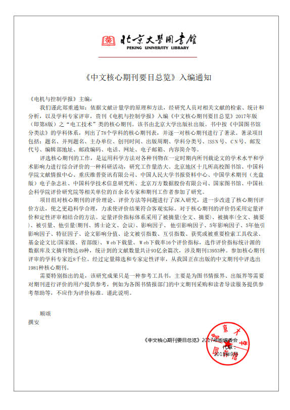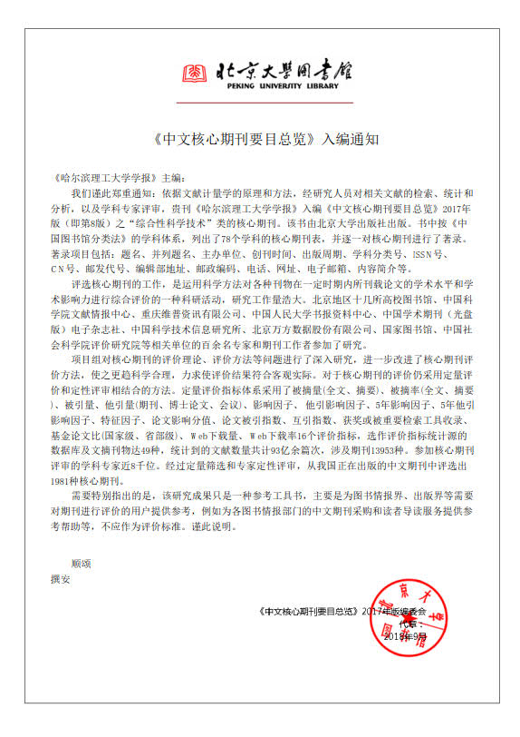 北京大学《中文核心期刊要目总览》是目前最重要的学术期刊评价体系之一,在学术界具有重要影响。此次对于核心期刊的评价采用定量评价和定性评审相结合的方法,定量评价指标体系采用了被摘量(全文、摘要)、被摘率(全文、摘要)、被引量、他引量(期刊、博士论文、会议)、影响因子等16个评价指标,涉及期刊13953种,参加评审的学科专家近8千位。经过定量筛选和专家定性评审,选出1981种核心期刊。在此次期刊评价中,我校《电机与控制学报》、《哈尔滨理工大学学报》同时再次入选《中文核心期刊要目总览》2017年版。