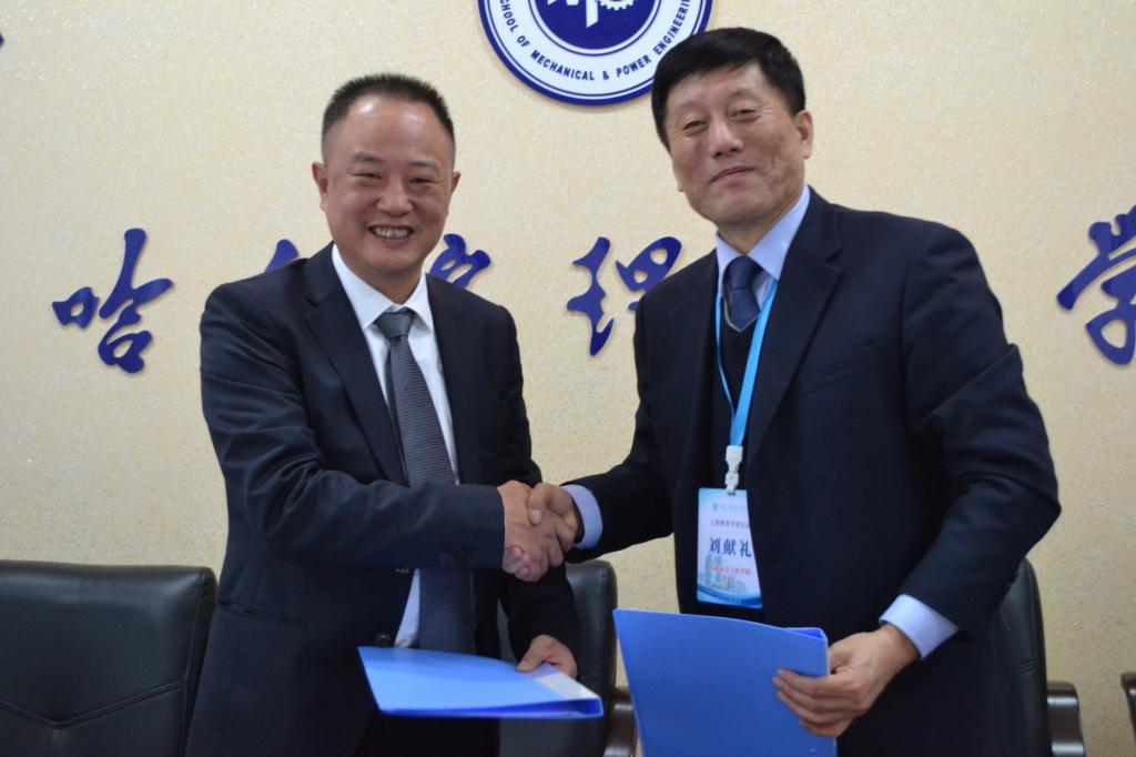 机械学院院长刘献礼与国宏工具系统(无锡)股份有限公司总经理吕显豹签署奖助学金捐赠协议书,并举行捐赠签约仪式。仪式后国宏工具系统(无锡)股份有限公司在C305举办哈理工机械学院专场招聘会,向参会同学介绍了公司的发展前景和科研实力,欢迎学生到公司工作发挥才华。