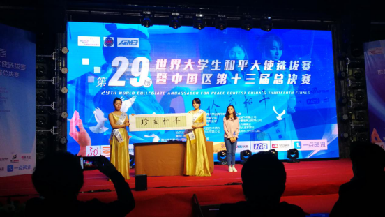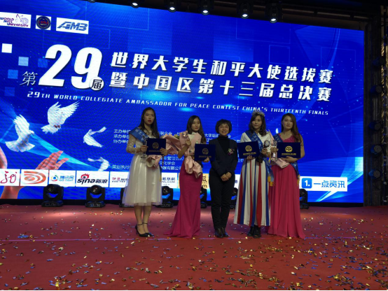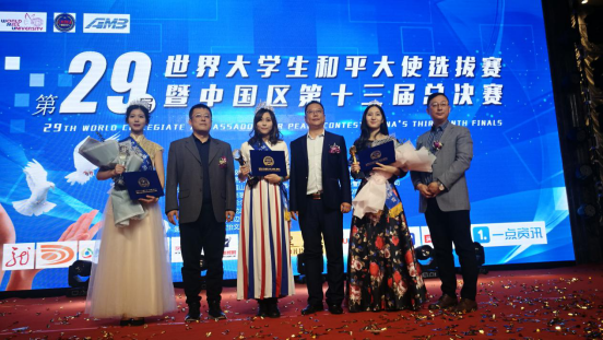 本次中国区总决赛共有来自全国各省的20名优秀大学生,经过中英文自我介绍、“和平主题”才艺展示、“和平”知识问答等环节,综合考察各位大学生的语言表达能力、亲和力、外语表达能力、才艺水平、服装搭配、肢体语言表达能力等方面。我校参赛的四名学生代表,积极努力尽显才华,最终英语MA18级研究生刘畅同学荣获了第29届世界大学生和平大使选拔赛暨第13届中国赛区总决赛冠军,英语MA 18级研究生马新月同学、张昳同学及英语系16-2班杨小棠同学分别荣获最佳阳光奖、最佳才艺奖和最佳创意奖。我校参赛的四名学生在大赛中表现出的沉稳大气的风格、丰富广博的知识储备和张弛有度的应变能力,得到了大赛评委的高度赞誉。