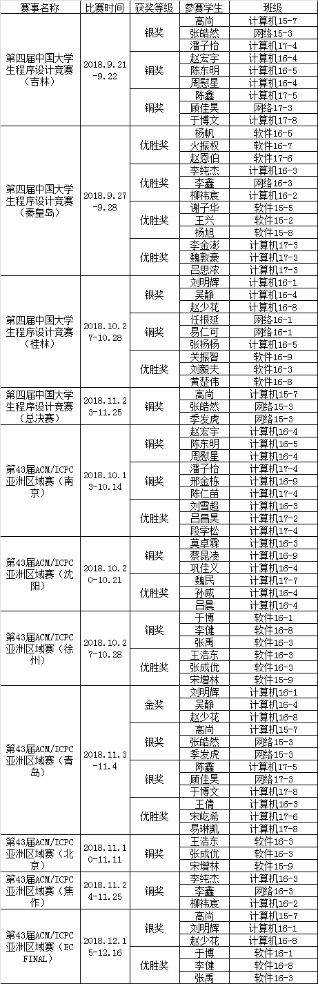 第43届ACM国际大学生程序设计竞赛(ACM-ICPC)亚洲区域赛、第四届中国大学生程序设计竞赛(CCPC)各赛站比赛自2018年9月相继开赛,我校学生代表队获得ACM-ICPC亚洲区域赛金奖1项、银奖3项、铜奖6项、优胜奖5项,中国大学生程序设计竞赛银奖2项、铜奖4项、优胜奖5项的优异成绩。