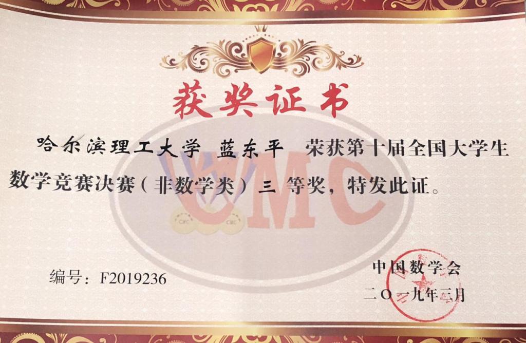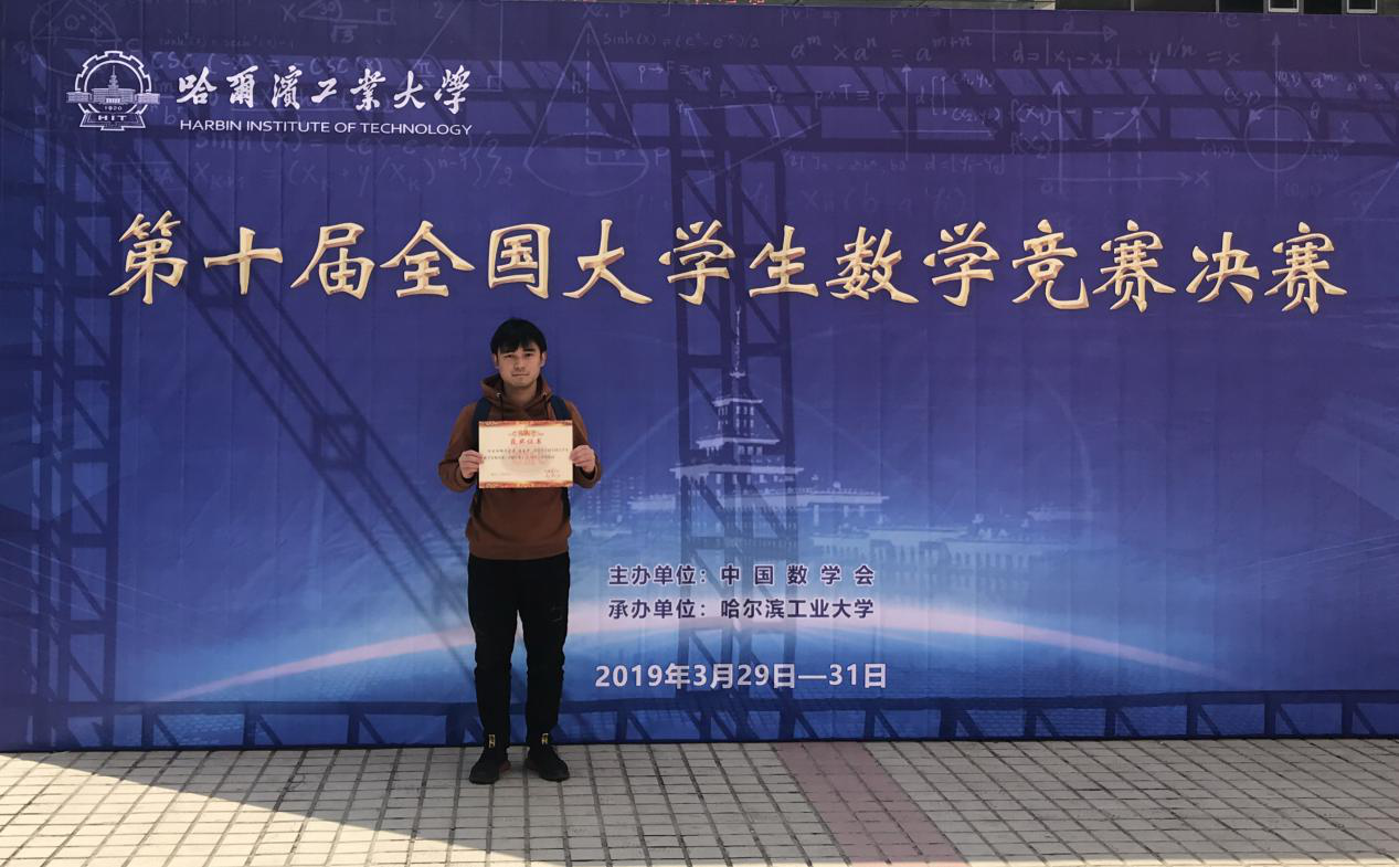 由中国数学会主办的第十届全国大学生数学竞赛决赛于2019年3月31日在哈尔滨工业大学圆满落下帷幕。本届全国大学生数学竞赛预赛共有全国31个赛区,参赛高校784所,报名人数138832人。经过选拔全国共有203所高校539名学生取得决赛资格,参加决赛的比例不足千分之三。我校测通学院15级通信工程专业的蓝东平同学与全国非数学专业组319名参赛选手同台竞技,荣获了决赛全国三等奖的好成绩。