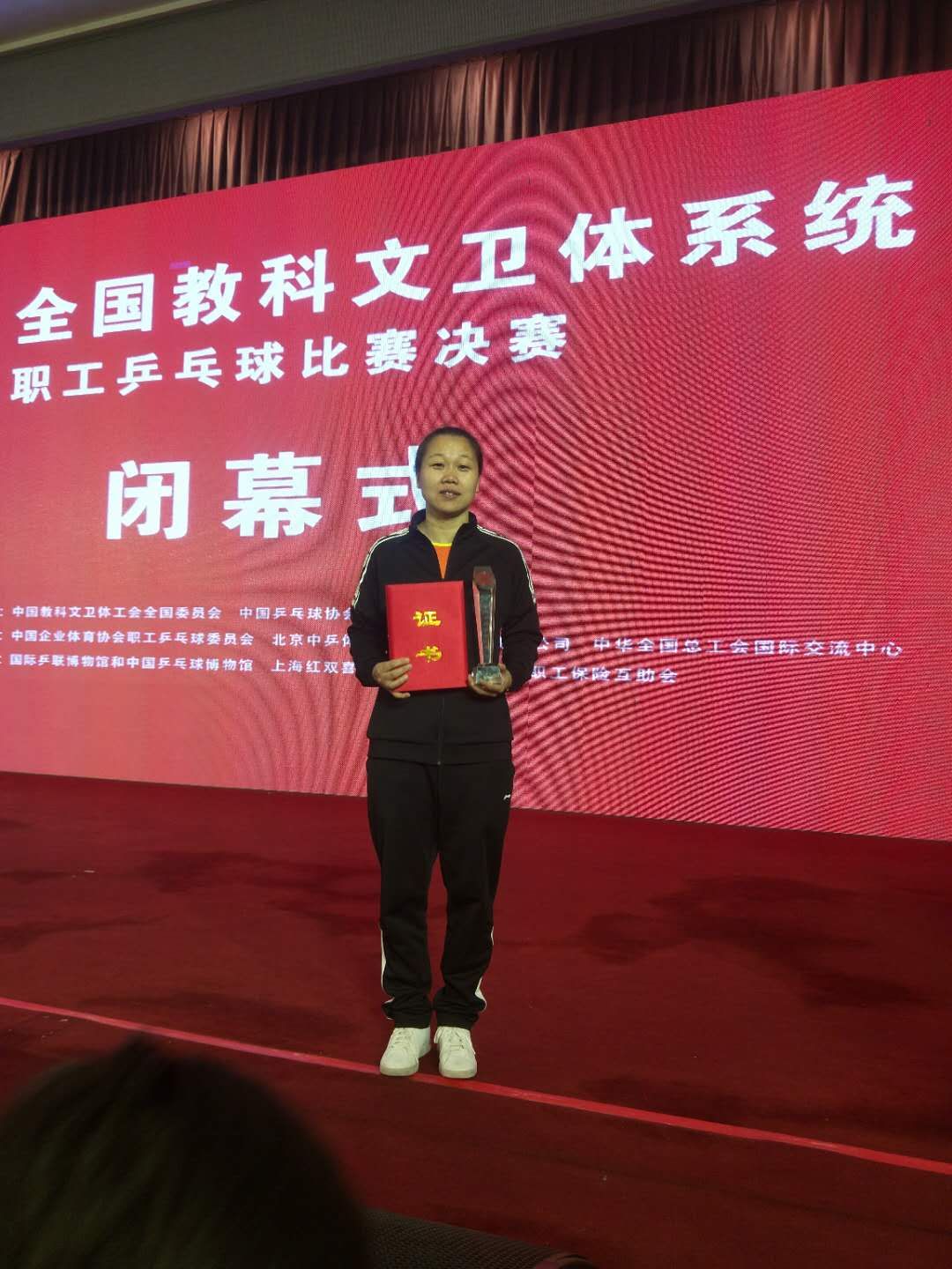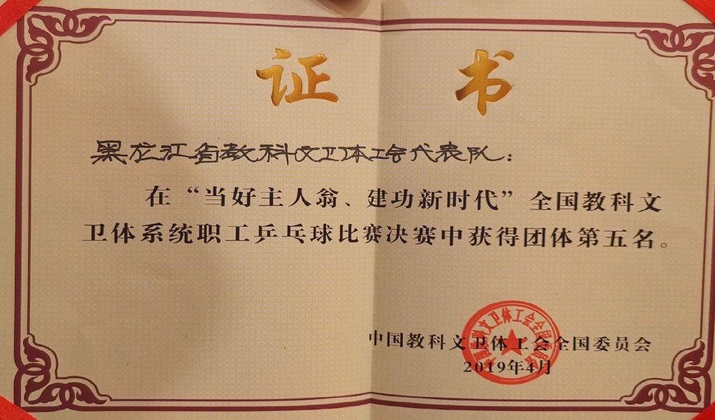 全国教科文卫体系统职工乒乓球比赛决赛于4月1日至3日在全国总工会国际交流中心举行。全国总工会党组书记、副主席、书记处第一书记李玉斌出席赛会闭幕式,为各组别前三名教职工选手颁奖。我省选手在此次比赛中取得了不俗成绩,尤其是我校教工杨松和幺兰作为黑龙江省教科文卫体工会代表队成员获得混合团体第五名(并列),幺兰荣获女子青年组第三名。