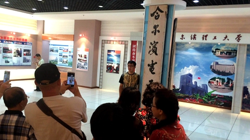 85级计算机校友一行45人于9月4日返校举办纪念活动后参观校史馆。校友们在展板前见到曾经住过的“筒子楼”,变成如今这般美丽、温馨的公寓时,无不感慨学校30年来发生的巨大变化。当参观到三校合并前的老学校牌匾时,校友们纷纷拿出手机与牌匾合影留念。